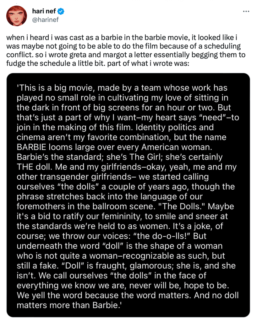 Soon after Hari Nef was cast as the ginger Barbie, she sent a letter to Greta Gerwig, practically begging her to rearrange the filming schedule so that she could make it. Greta Gerwig is the screenwriter and director of Barbie, she has also worked on films like: Little Women, and Lady Bird.